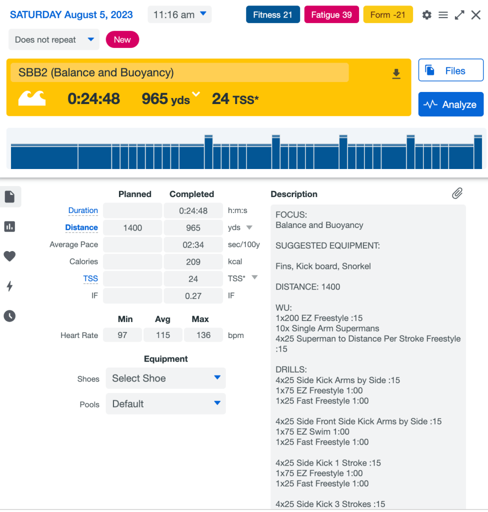 Had to cut the swim a little short today. Was feeling good but, well, nature was calling and after that I wasn’t getting back in the pool. Oh well, it’s a good start and I’m giving myself permission to smile and accept it.